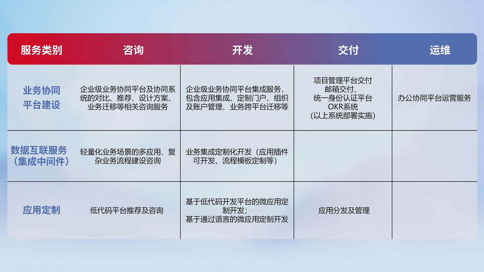 针对钉钉、、企微、、、、IDaas等平台级产品提供产品的规划、、方案、、交付、、定制化开发等服务,,,,实现如统一协同办公、、、、智能客户服务、、、混合会议管理、、、、智能数据查询、、、等业务场景,,,,实现数字化转型。。