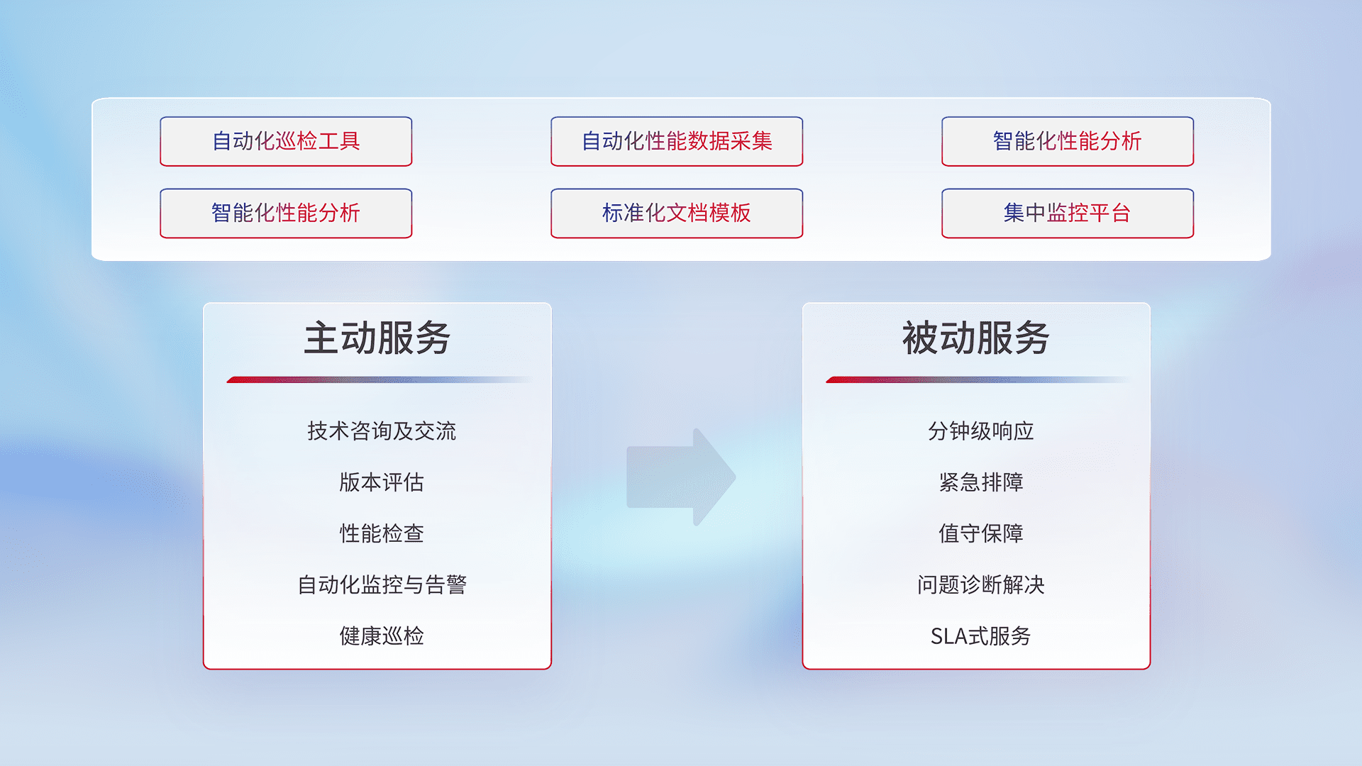 智能化工具和标准化文档,,保障服务质量,,,提供主动服务(包含技术咨询、、、版本评估、、、性能检查、、自动化监控与告警、、、、健康巡检)和被动服务包含(分钟级响应、、紧急排障、、值守保障、、问题诊断解决、、SLA服务)。。。